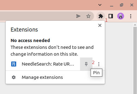 Welcome to NeedleSearch!Click on the Extensions icon in your toolbar. If you click on the "N" icon representing the extension while on a webpage, you will have the option to like or dislike the page. Try it now! You'll need to log in, so nobody rates the same page multiple times. I suggest you pin the extension, so this can be done faster in the future.From now on when you use Google Search, you'll see the like percentage (from 0% to 100%) shown next to each result.This will help save you time when browsing, and with enough users, maybe even start to change internet incentives from SEO to creating good content.
